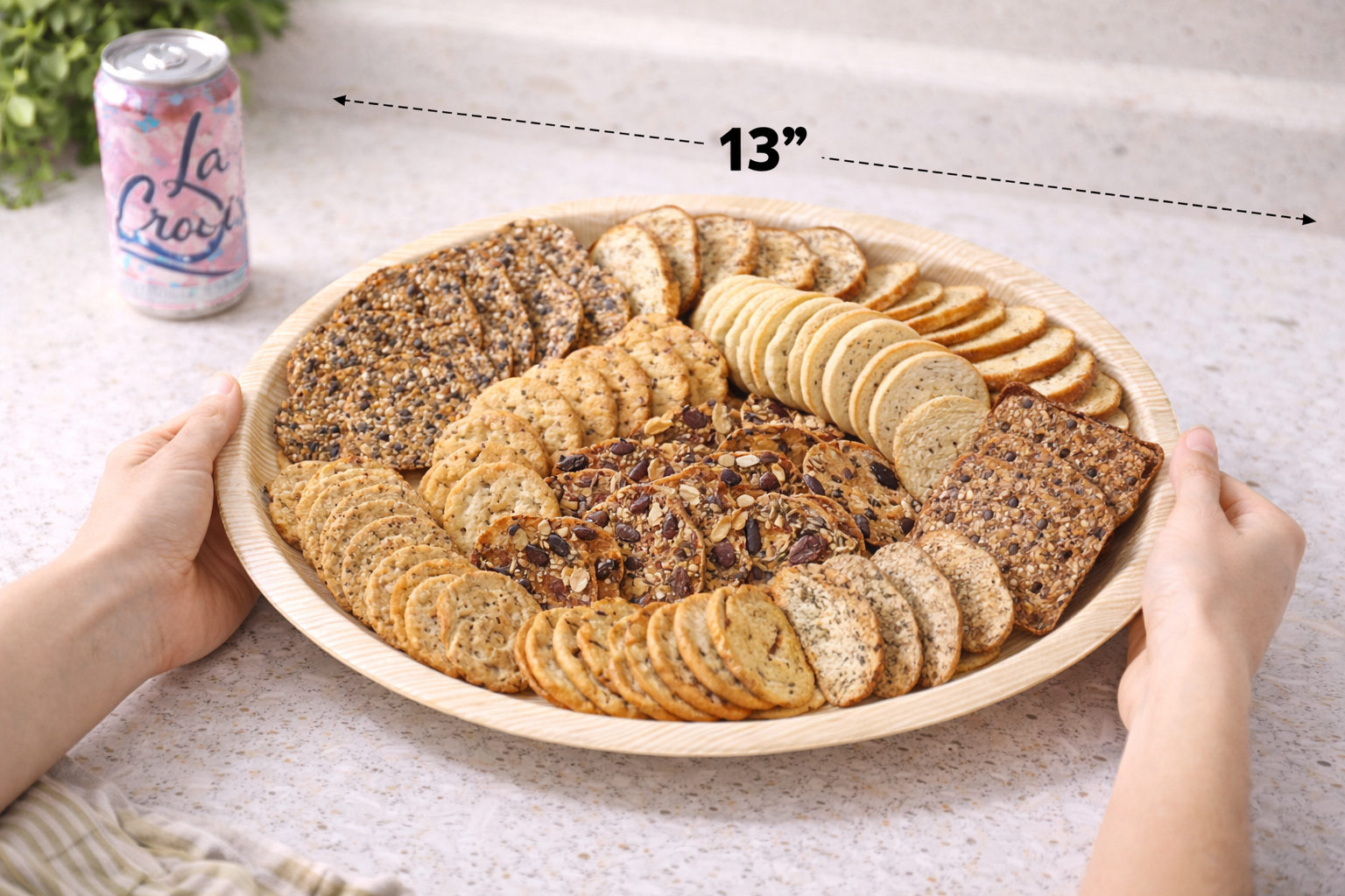 Our Accoutrements Platter is filled with an assortment of artisan crackers, crisps, and bread options. Ideal for expanding grazing boards or serving alongside charcuterie boxes and platters.