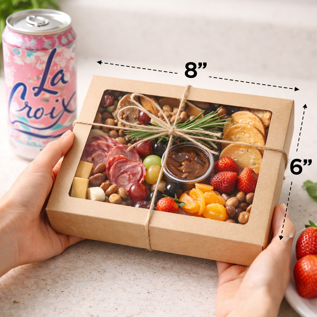 The Personal Charcuterie Box offers a generous individual portion, beautifully arranged with premium cheeses, cured meats, fresh fruits, crackers, and house pairings. Ideal for lunch, meetings, or satisfying solo graze.