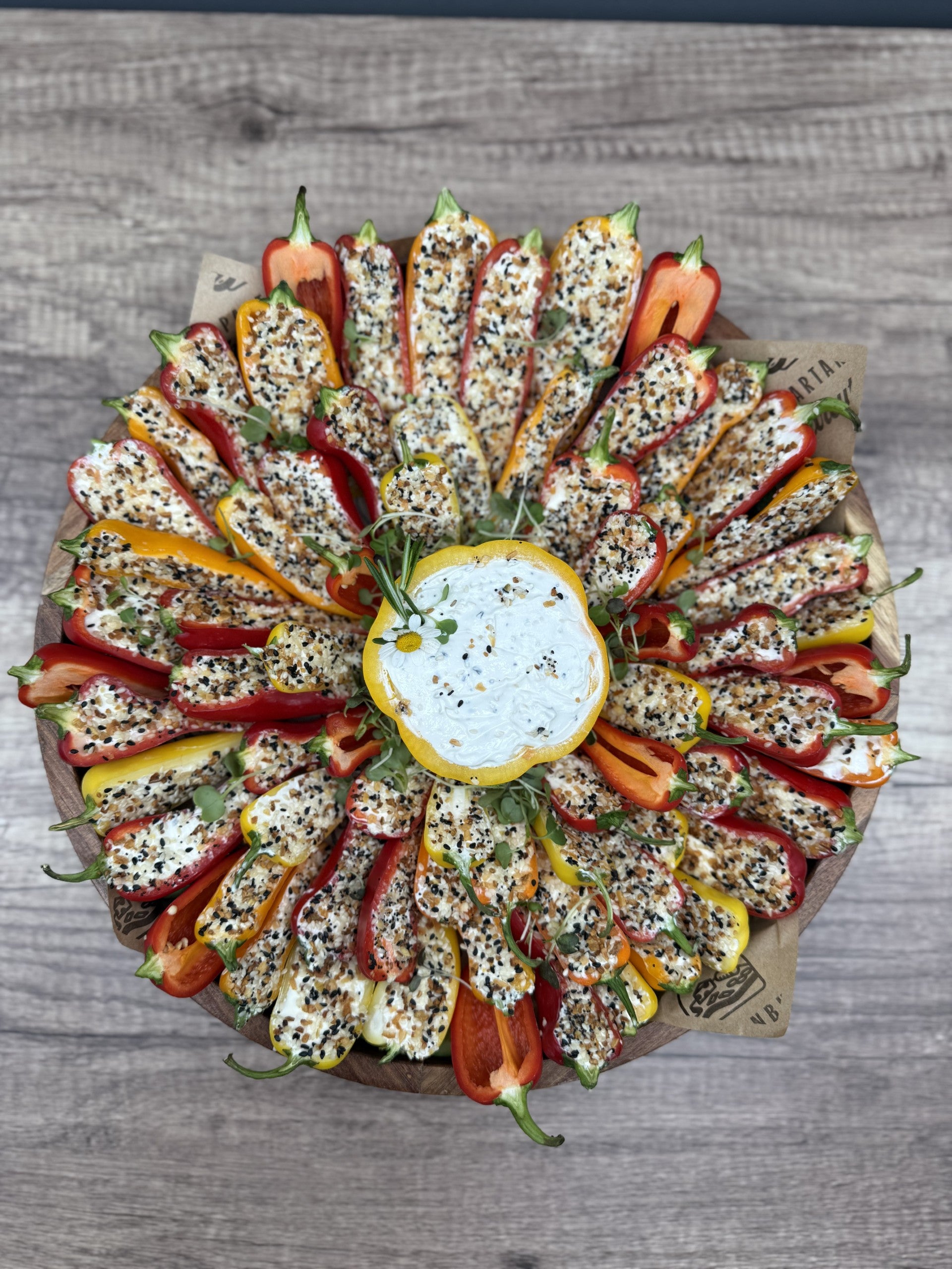 This platter features mini sweet peppers generously stuffed with a seasonal cheese filling and finished with herbs and garnish. Eye-catching and delicious, it's ideal as a vegetarian appetizer or a standout addition to your spread.